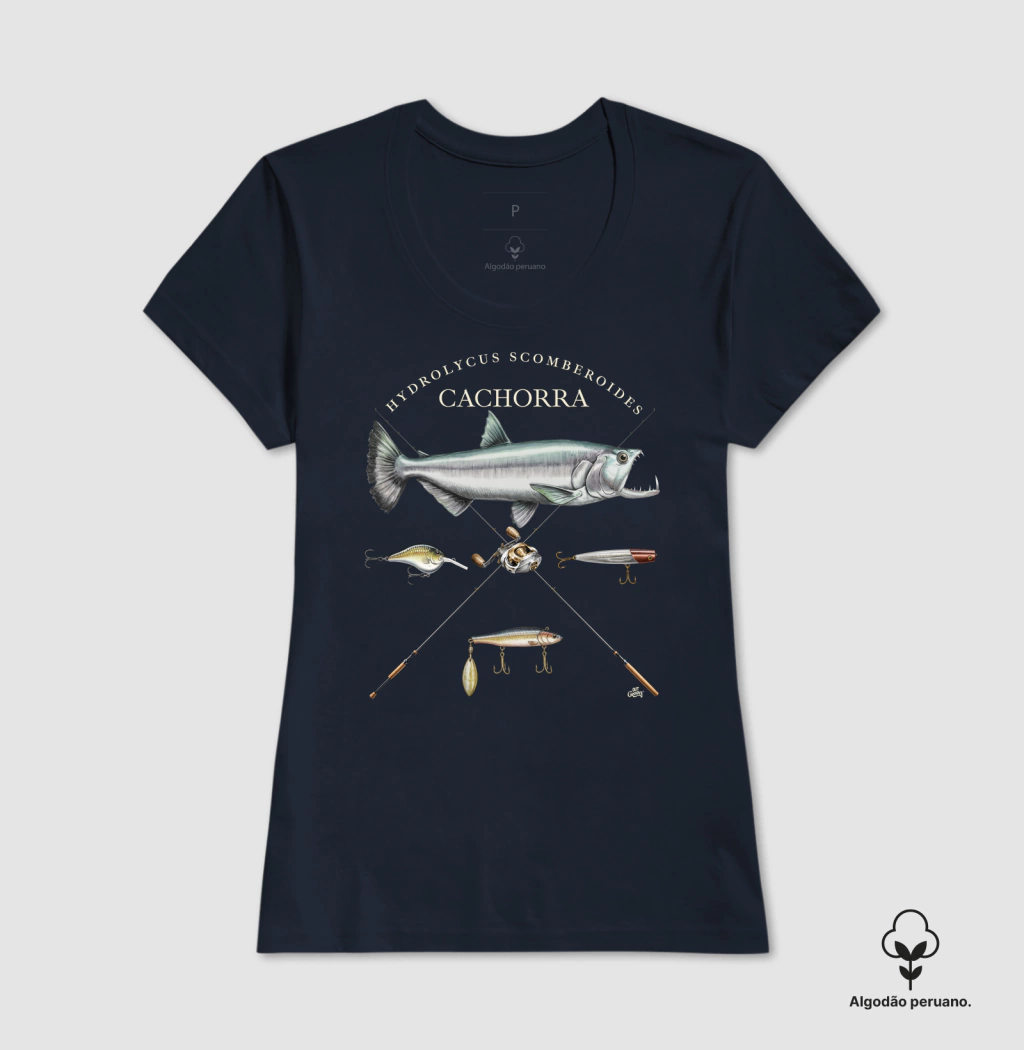 A estampa “CACHORRA - Bait Casting” da Out Groove traz toda a energia e beleza do peixe “Cachorra” (Hydrolycus scomberoides). Com detalhes impressionantes, esta arte foi criada para quem ama a pesca esportiva e admira a riqueza da fauna aquática brasileira.