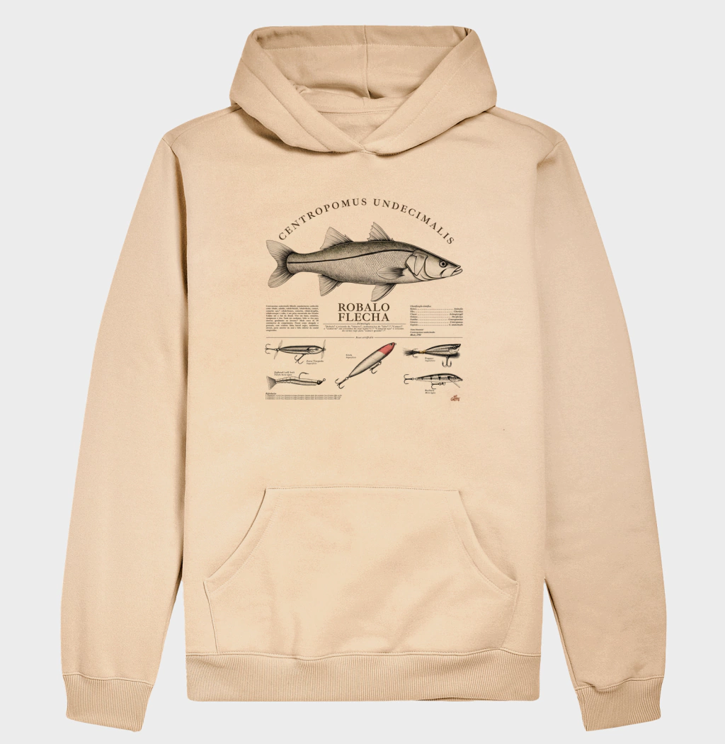 Estampa “ROBALO - Enciclopédia Style” da Out Groove, feita para os entusiastas da pesca esportiva. A arte traz detalhes do peixe Robalo (Centropomus undecimalis) e ilustrações de iscas como Zara, Jerkbait e Torpedo, além de informações científicas sobre o peixe, combinando estilo e conhecimento. Perfeita para quem aprecia os aspectos técnicos da pesca e a beleza dos peixes.
