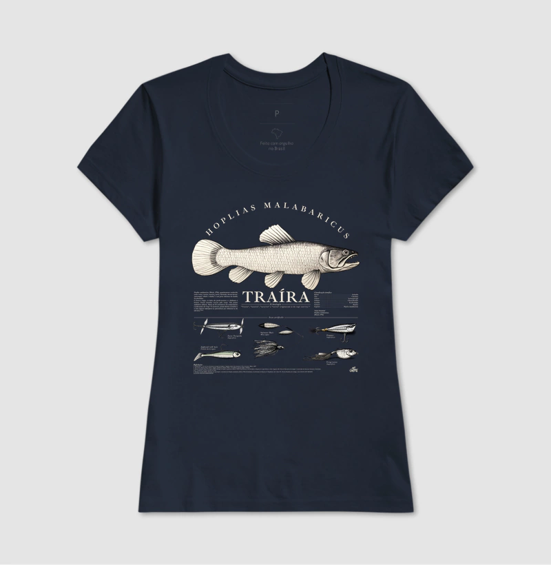 Estampa “TRAÍRA - Enciclopédia Style” da Out Groove, trazendo uma visão detalhada da traíra (Hoplias spp.) e suas características. A arte combina o estilo técnico de uma enciclopédia com o design visual das iscas, como Popper e Zara, apresentando um conteúdo educativo para os pescadores mais técnicos.